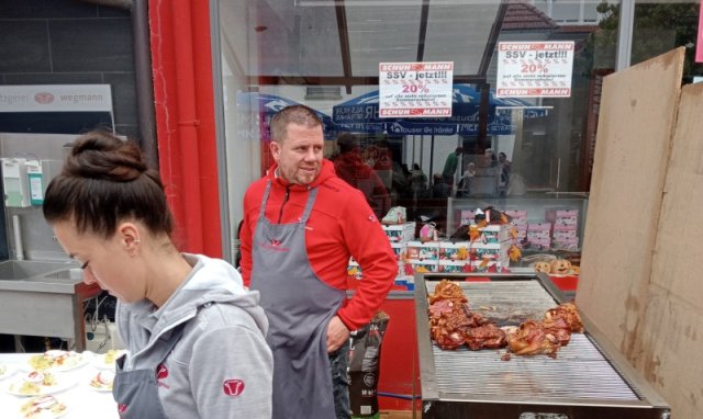 Bad WurzachÜber Bad Waldsee geht es nach Bad Wurzach, wo gerade ein Stadtfest ist. Der Regen hat aufgehört, wir bummeln durch die Stände. Erst Flohmarkt, dann Produkte und zuletzt Essen. Eine junge Dame nimmt Schweinebraten vom Grill und schneidet ihn. Erst wird alle Kruste grosszügig abgeschnitten, das Wasser läuft uns im Mund zusammen, nur die verbleibende Mitte kommt in den Verkauf, die Kruste in den Kübel…?! Wir intervenieren rechtzeitig, wollen nur die Kruste und bekommen sie auch, erst noch gratis?! Zurück im WoMo geniessen wir den Abfall…